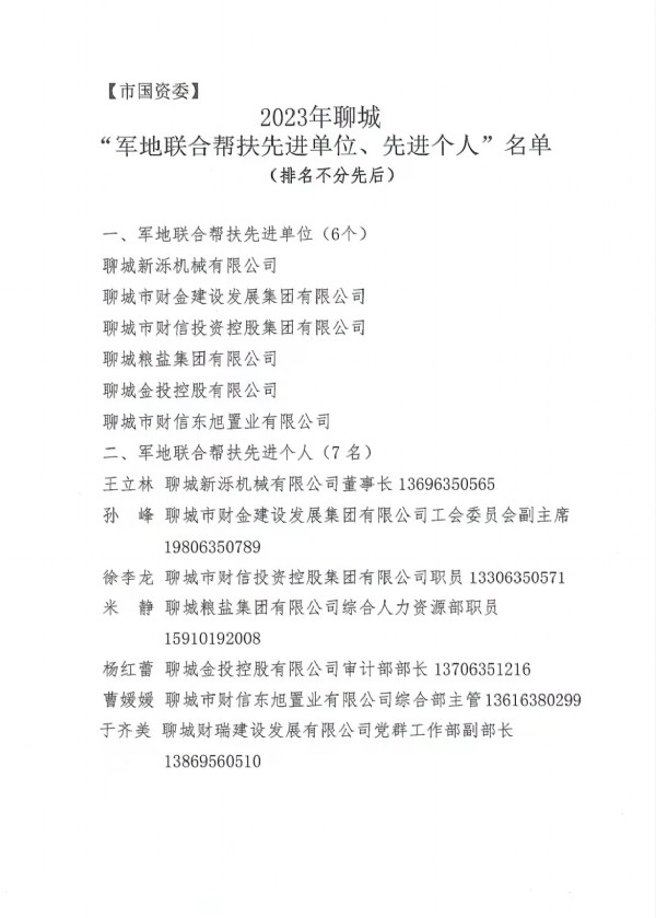 聊城市財金建設發(fā)展集團有限公司被授予“軍地聯(lián)合幫扶先進(jìn)單位”榮譽(yù)稱(chēng)號,工會(huì )副主席孫峰同志被評為“軍地聯(lián)合幫扶先進(jìn)個(gè)人”。