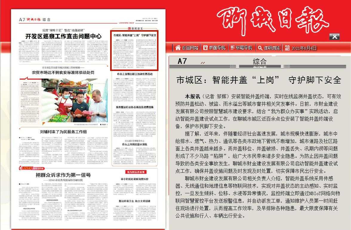 8月4日出版的第20210804期《聊城日報》在A(yíng)7綜合版塊刊發(fā)文章《市城區:智能井蓋“上崗” 守護腳下安全》,詳細介紹了智能井蓋的功能和優(yōu)勢。
