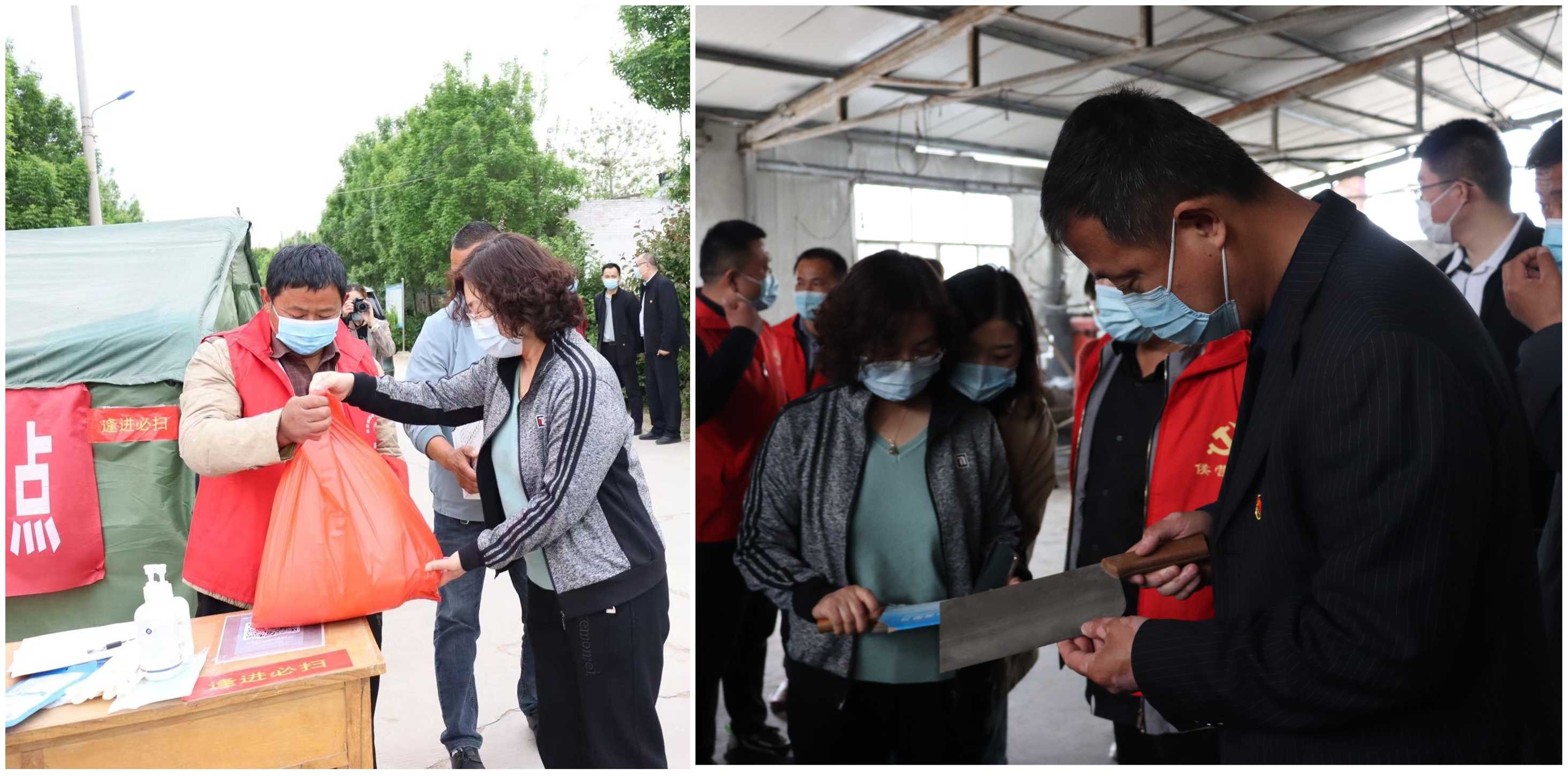 隨后,楊震一行來(lái)到何屯村疫情防控點(diǎn),開(kāi)展疫情防控知識宣傳并捐獻防疫物資,在村委書(shū)記王鴻剛的陪同下參觀(guān)了德鑫齋刀場(chǎng)。